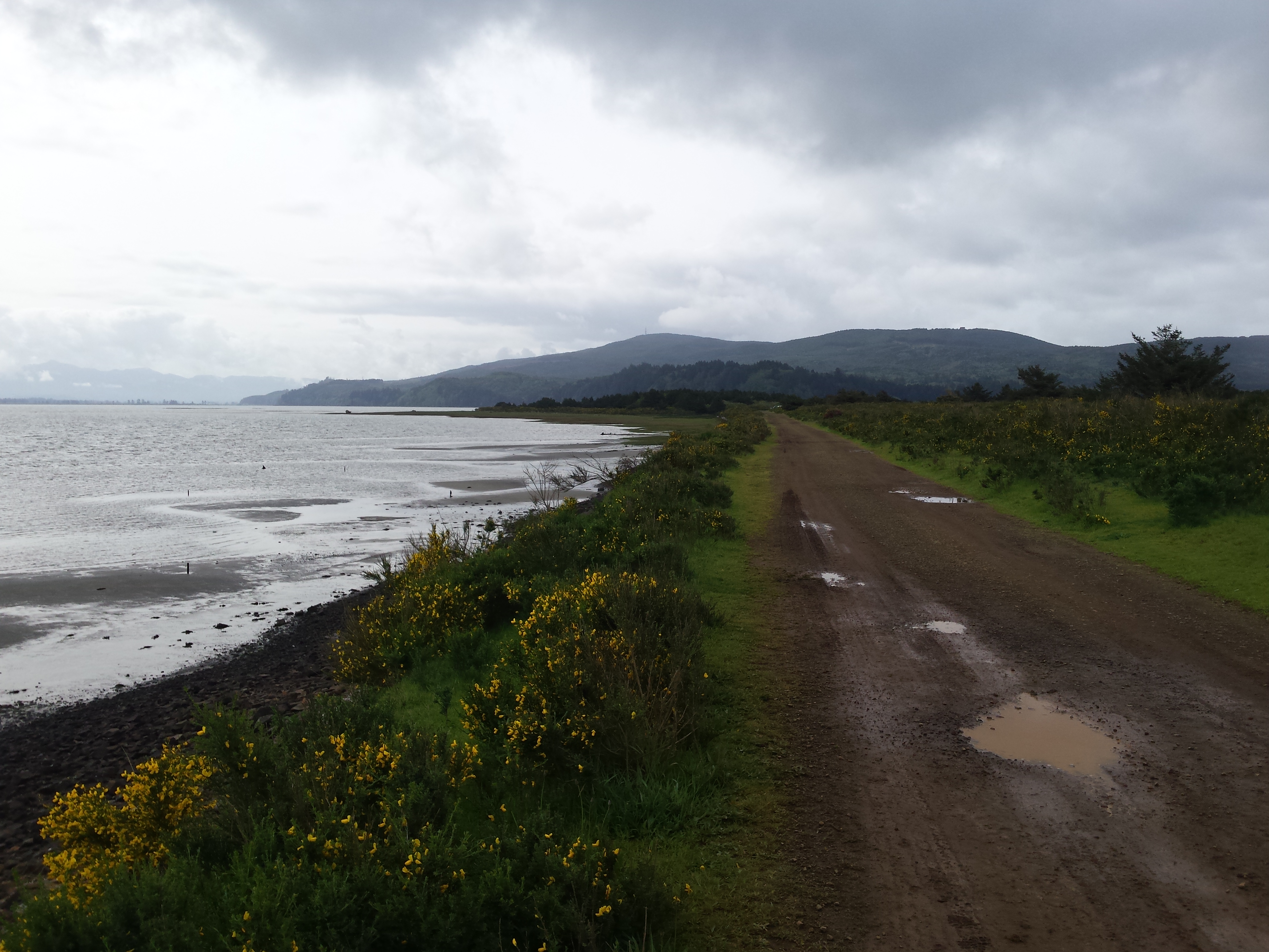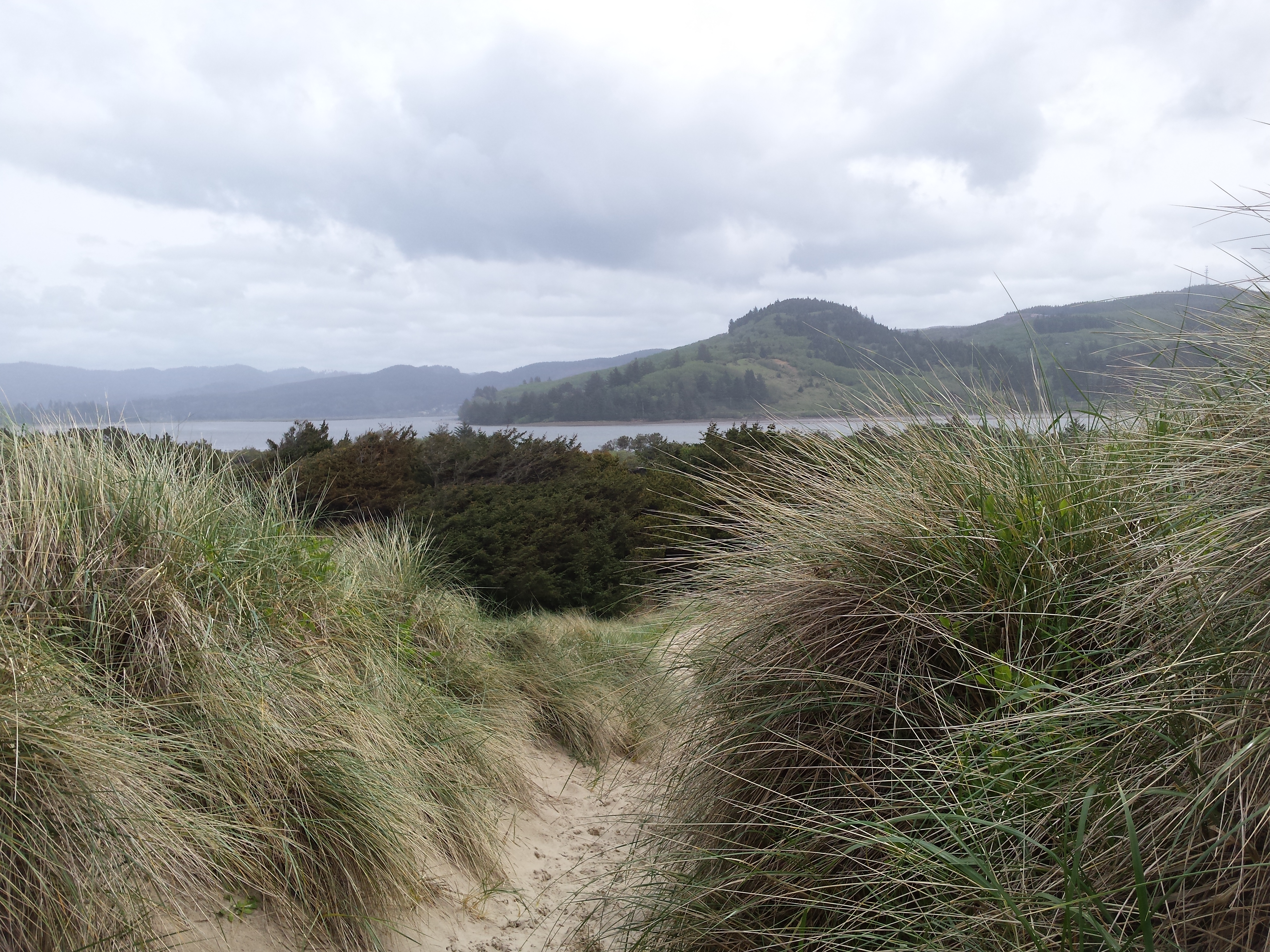 Near the town of Nehalem, we met unexpected sand dunes in the State Park. They ripple in the wind with sharp-edged grasses; wild strawberries flower on the margins. Climbing, the Coast Range and the long rolling shore both hide from sight until you’ve reached the saddle. Then: behind hills of sand, mountains gray as rain, and to the west, endless ocean that only seems flat from here. A single harrier – my first – slid along a length of air, as a human hand caresses softest silk.