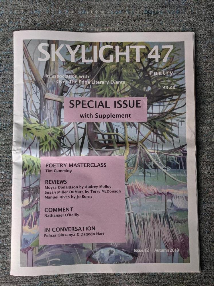 Skylight 47 is based in Galway. I’ve never been there (yet), and I know no one who lives there, so I’m unsure how the magazine crossed my radar. I’m so glad it did. Really, it’s a newspaper, but in color. It smells delicious, it catches just briefly beneath my thumbs, it crackles invitingly whenever I turn a page. It requires two hands to read: an immersive experience in a time of fragmented attention. And it’s full of poetry, mostly by Irish folx. I’m enchanted.