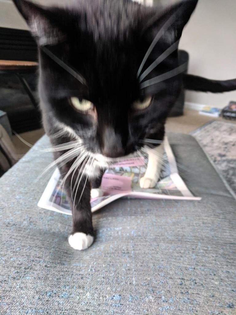 Wrinkles on the page pictured above are brought to you by d’Artagnan the black-and-white cat, who cannot resist a paper artifact intended for human reading.
