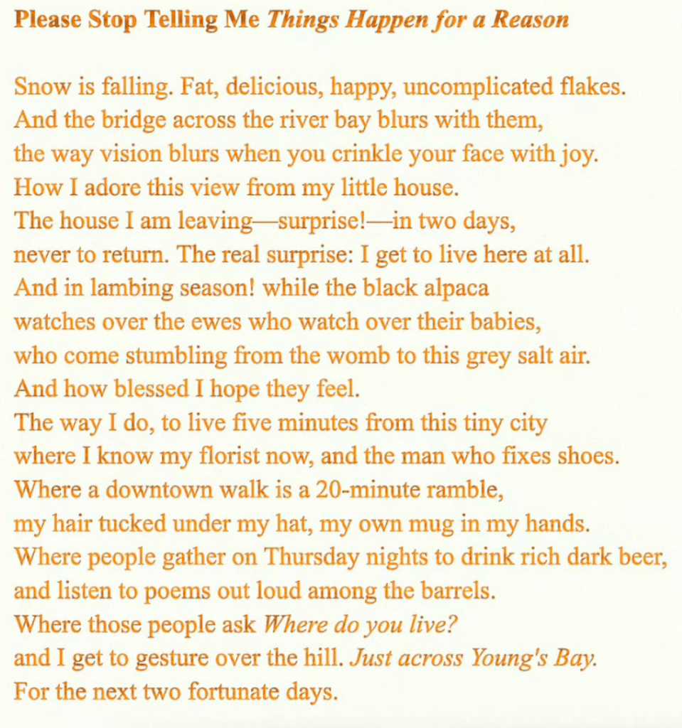 Please Stop Telling Me Things Happen for a Reason March 8, 2024March 4, 2024 / Tara K. Shepersky The title of this thing you’re reading is Proseletter, but today you get a PoemLetter. A PoemLoveLetter: to the feeling of home, to my briefly-loved tiny city of Astoria, to joy. Share this: Click to share on Tumblr (Opens in new window) Tumblr Click to email a link to a friend (Opens in new window) Email Click to share on Bluesky (Opens in new window) Bluesky More Click to share on Pinterest (Opens in new window) Pinterest Click to share on WhatsApp (Opens in new window) WhatsApp Click to share on LinkedIn (Opens in new window) LinkedIn Like Loading... Related