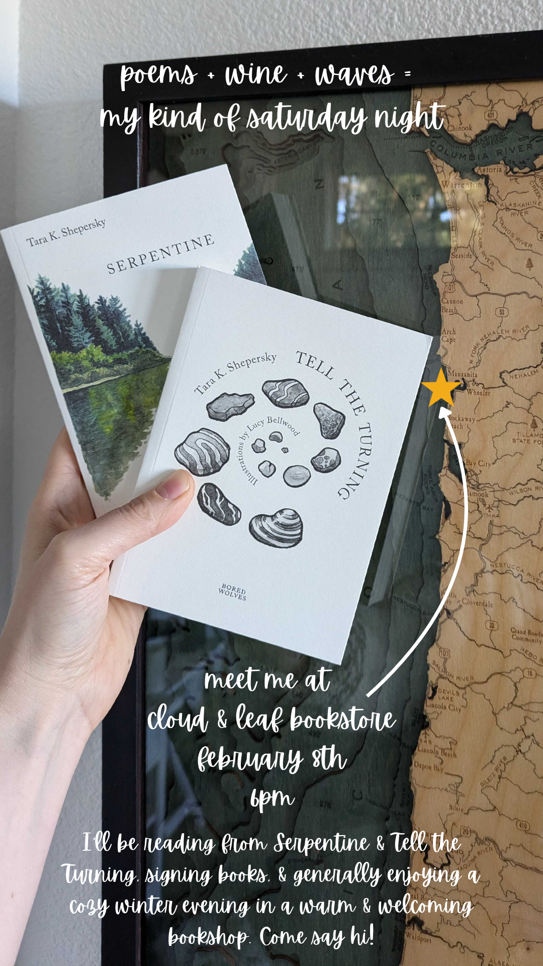 I’m reading poems and signing books on Saturday evening, February 8th, at the excellent Cloud & Leaf Bookstore in Manzanita, Oregon, and I would love for you to be there.